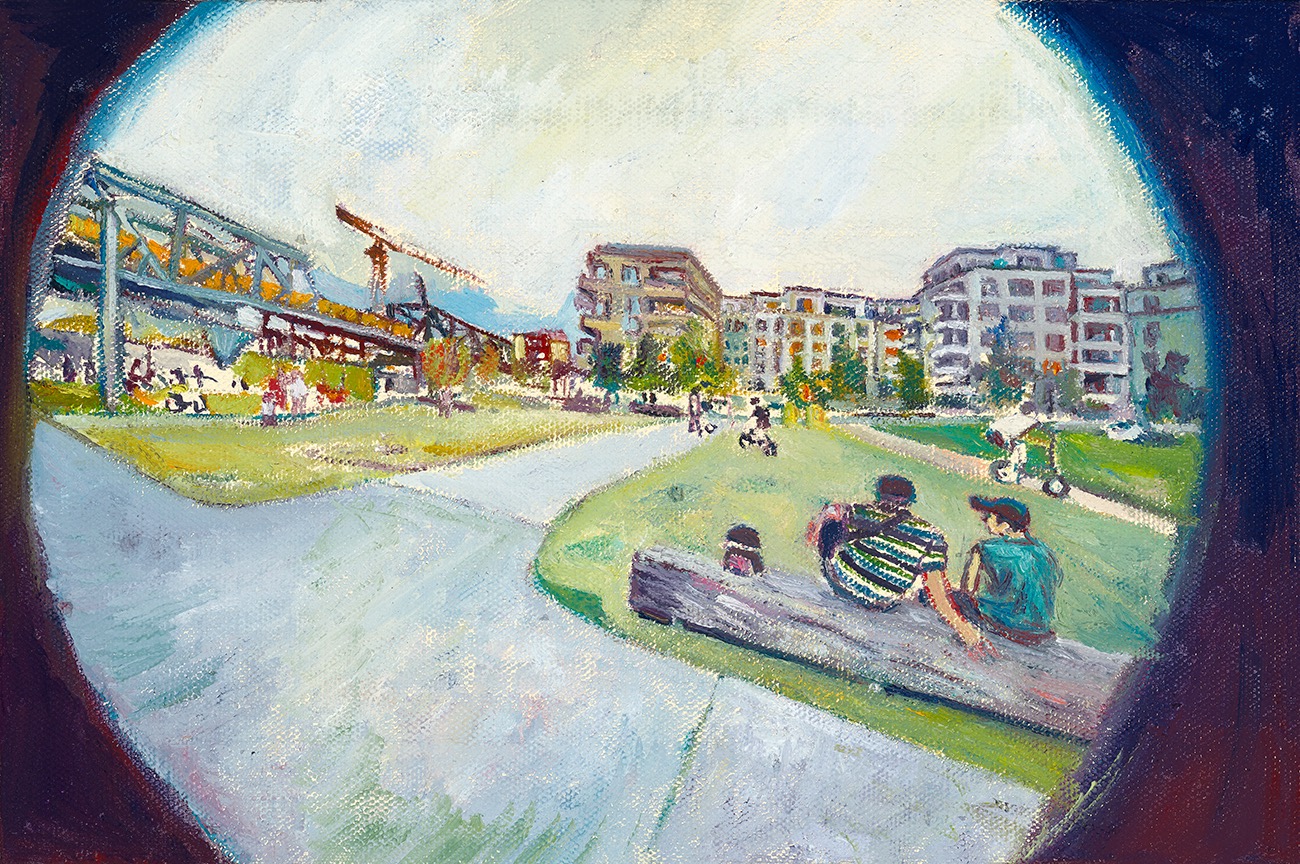 I was walking from the Gemaldegalerie to the train on my recent “flaneur” trip to Berlin, and although the park at Gleisdreieck is relatively new and popular, at dusk on this lonely day it was a bit destitute, save for friends enjoying the last light skateboarding and fraternizing, warmth in the cool night of day. With the cranes in the background, it reminded me of when I first came to Berlin, on a trip after college, just before the wall came down, a dystopic hodgepodge of new and old buildings rising from the rubble of history into a new tomorrow.