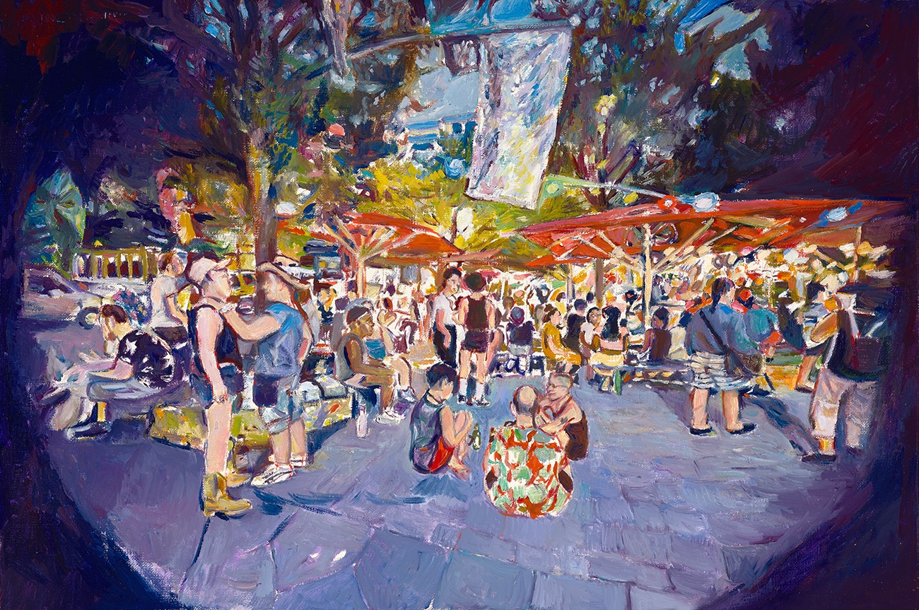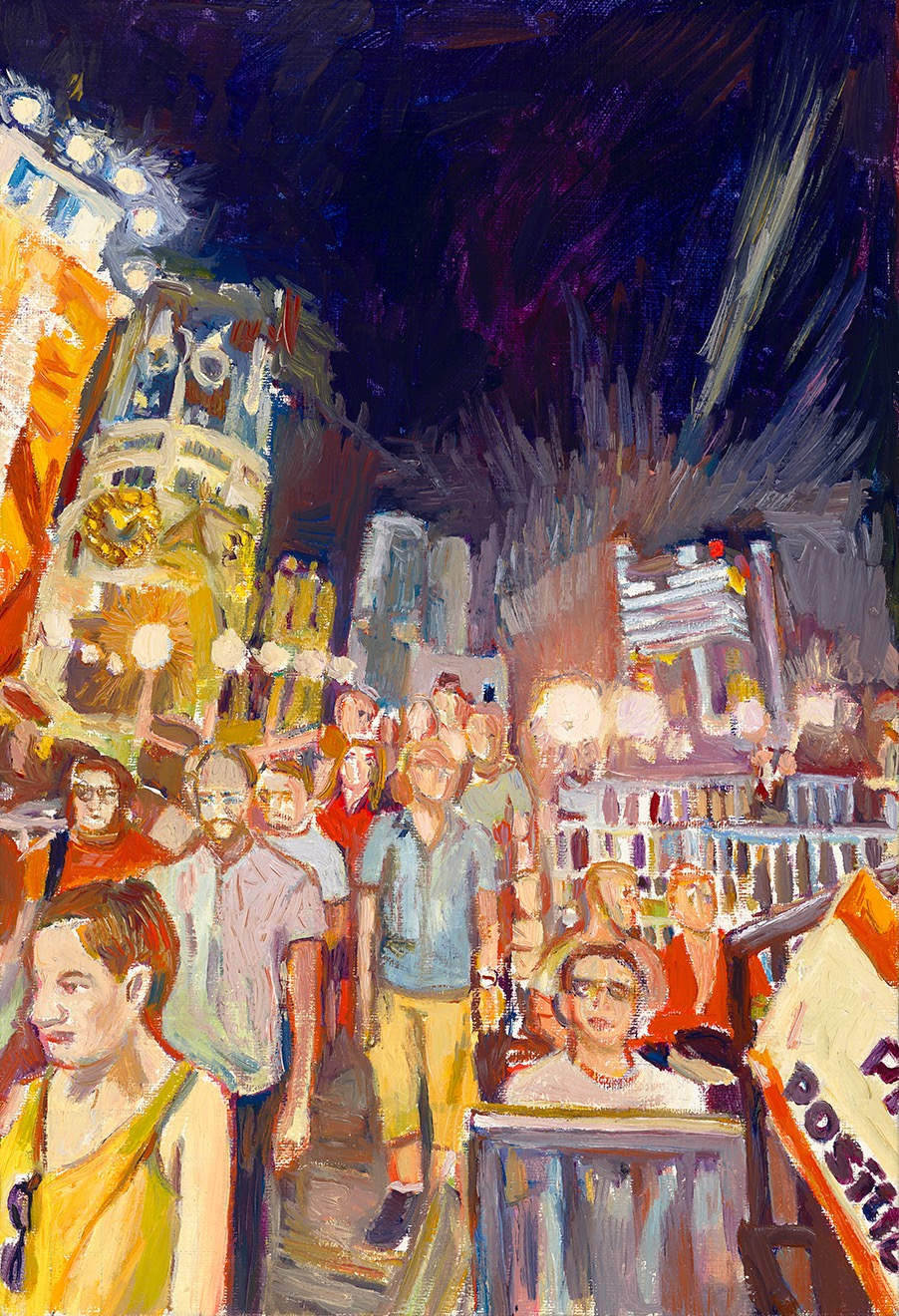 On my recent travels through Berlin in Kreuzberg, I was delighted to see a large queer contingent of activists and party-goers, underneath the aluminum foil blankets given to the children immigrants in cages, repurposed as poignant flags and reminders of the far right in America, bringing the global dialog to these locals opposing the German Nationalists. The commiseration of these gender-bending individuals was heartening, and by painting them I was reminded of my own youth and leftist activist leanings, stepping into the painting to be one of them, one of us.