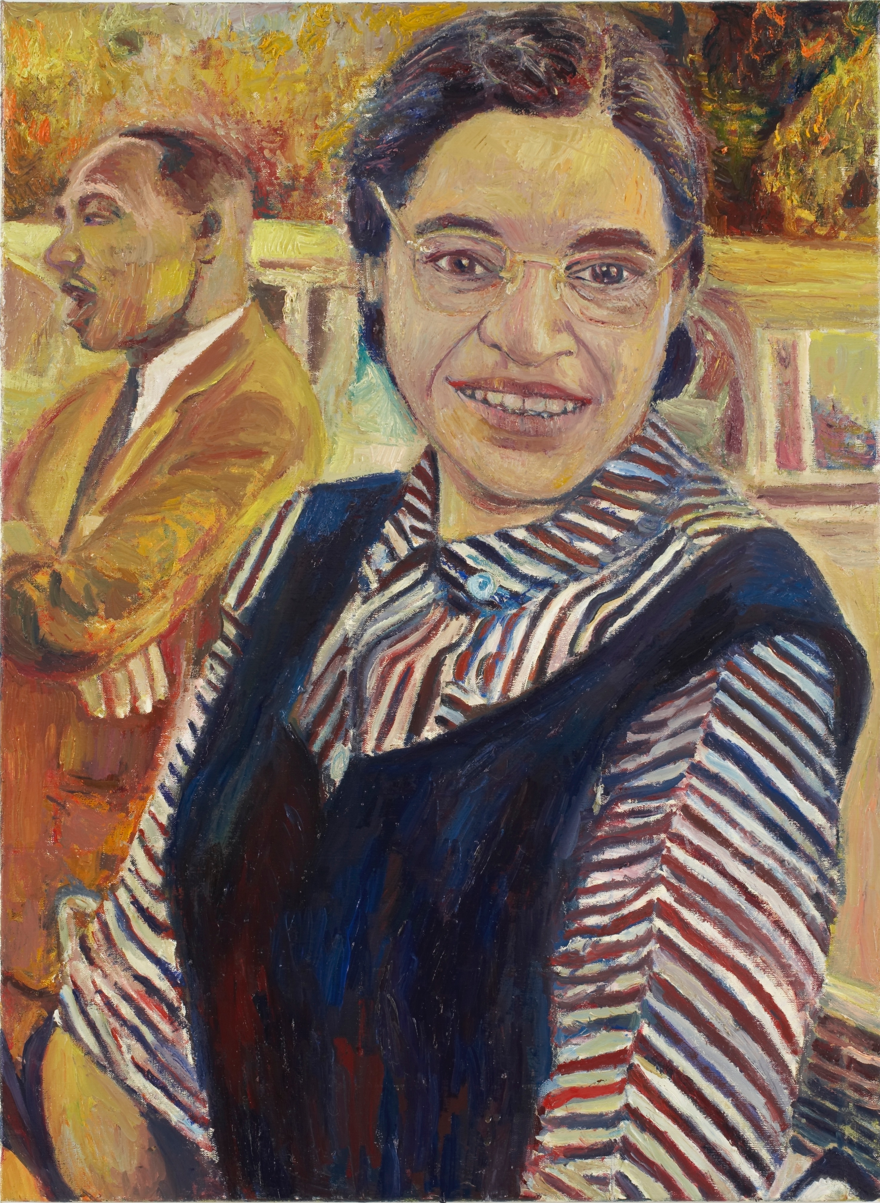 Martin Luther King Jr. and his family are presented playing the piano in the painting “Drum Majors” to represent not just the scene transpiring but the symbol of how King wanted to be remembered in his last famous speech and the current generation of leaders who invoke him and Coretta Scott King as their models. This picture was originally included in my exhibition at LIGHTBOX gallery in Los Angeles in 2008 called “Good Leaders, Endangered Species, Ships at Sea Pt. 1”, because, at the time, when the political campaigns and debates had already begun for the next American President, I felt that good leaders were like an “endangered species” in a world that was like a “ship at sea”. I have always been moved and inspired by Dr. King and the civil rights movement in general, and being born in 1966 have my own childhood affiliation with the memory of him (and the assignation and aftermath) on television and the media, and hope do whatever I can as an artist, teacher, and human being to contribute my efforts for equality and the recognition of the agency of all peoples in my life, which includes the fine art world of galleries and museums. I love Dr. King and everything he stood for, and wanted to pay homage and respect with this painting (one of several I have created around Dr. King, including his appearance also in this exhibition in the background of the portrait of Rosa Parks).