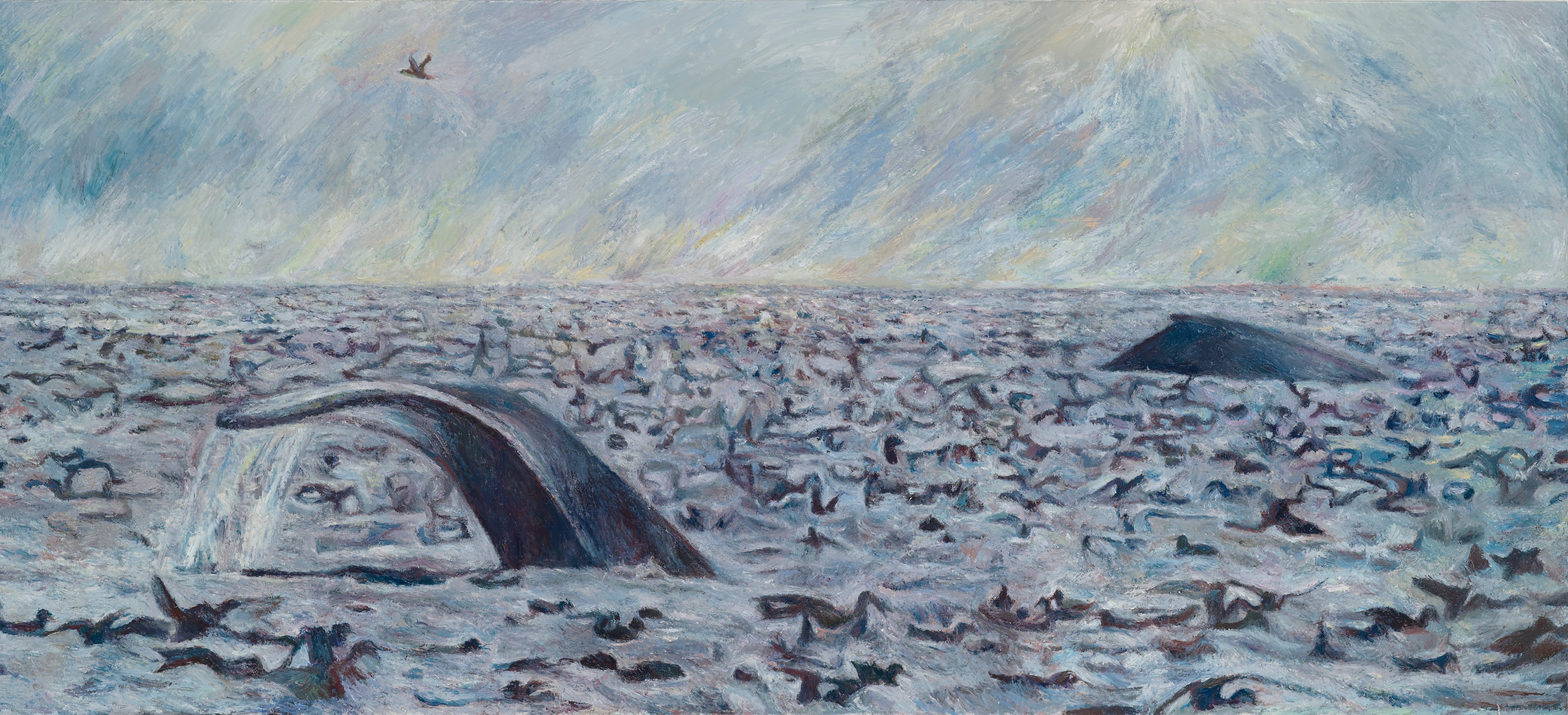 This is from a scene in one of the David Attenborough nature series, of Humpback whales in the southern oceans of the Antarctic, who "fish" there for krill, a shrimp-like crustacean that exists in abundance, and the many birds all the other wildlife that this incredible event attracts. So many of the whales somehow know to go to this area, and work together to form net-like rings of bubbles that gather the krill in the center in which they come up the middle of to feast. I had wanted to do a painting of a real utopia, but was thinking of creating a painting of Bal’I Ha’I, from the film music South Pacific, of a mysterious island of paradise, and realized that real utopias do exist on Earth. Whales are such mysterious creatures that we still don’t know much about (although I’m a firm believer that they are sentient creatures that have a high degree of sophistication and would communicate with us more if they could), and scenes like this for me reach the sublime of nature, that we don’t know so much about this world and all of whom we share it with, and we are such narcissistic creatures we forget we are small part of the cosmology of living things in our world and our universe. I placed this work in a heavenly realm on the Last Judgment wall as I feel it truly is a heaven—perhaps we become reincarnated as whales or dolphins when we pass—maybe those who are doomed are the krill! But in all seriousness, heaven is on earth, beauty is everywhere on our planet, and I hope that we can survive as a species cultivating life on our planet instead of destroying it, getting smart about how to be our Earth’s caretaker for all those who benefit from it, most of all ourselves and future generations who rely on what we do now for their future—for us and all of our mother earth’s inhabitants. I hope like my other works this breaks into an abstraction, specifically allegorical for this one as we are like the fish in the sea—there are many of us and we need to cohabite with one another, respecting each other and our differences, and be together in our lives on our globe in order fur us to survive positively into the future. I do believe that art can change things for the better, and in my old age I would rather paint utopias than dystopias, as I want to live in the place I’m rendering to be in that meditation of my moments, in order to create works that will hopefully inspire others in their ponderings while looking at it—I think if we can all agree we need whales to be alive and roam free in our waters, along with other animals endangered or not to be alive on our planet, then that starts the even bigger conversation how we can do this all together in a karmic spirit of community and cooperation, commiseration of empathy and compassion for all.