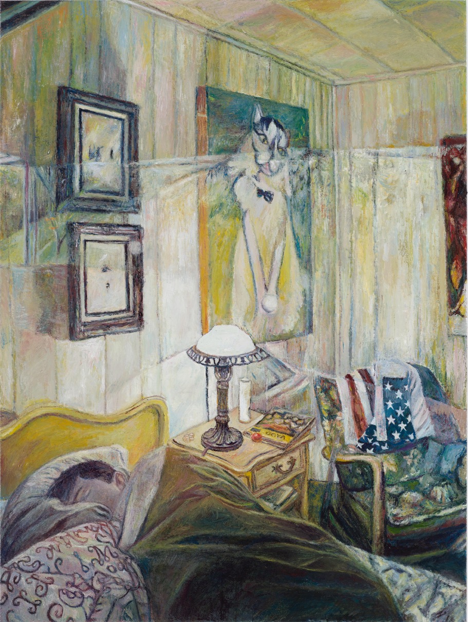 “Sleeper” is a portrait of my husband Andrew, from a photo I took one afternoon at our cabin in Riverside, California, through the window, with the reflection of the hill behind our home appearing simultaneously as the image through the window, in addition to the lens flare of the camera itself. “Sleeper” is not only the subject matter of the image, but also a reference to one of our favorite Arthur Rimbaud poems, called “Sleeper in the Valley”, which describes the life surrounding a dead soldier in a field. While Andrew is very much alive, the visionary aspects of the poem–which reflected upon the living agency of nature and the world transcending humans’ understanding of the normal everyday, is hopefully reflected in the reflection, and the mash-up of symbolic representation. The narcissism of our ego’s filtering out the life of how our environment can defy categorization and understanding is something I feel is the artist’s job to expose, and someone like Goya, whose book appears on the nightstand, did this in extraordinary ways, allowing his symbolic allegories to jettison his hand and mind to paint ultimately ineffable works that we feel, but can’t completely explain away. The book is next to a red plastic ball that reminds me of a clown’s nose, and I like the juxtaposition in that I feel much of my work seems like a tragic comedy, or Goya with a clown nose. Of course the American Flag appears, invoking our great country but here in the form of a towel draped across an old chair (which like much of the furniture, including Andrew’s grandparents bed and nightstand, have much history and meaning for us). In the room hang older works by me that I have given to Andrew over the years, including early framed Pinocchio drawings, and a large painting of a cat from the early ‘90’s (I’m proud to say other pet paintings of this series are owned by LACMA and SF MOMA). I hope, with the pillowcase next to Andrew, that this work (in addition to all my art) ultimately defies language, like the great paintings and art that inspire me, and enjoy how the letters on the pillow begin to break apart in their folding and eclipsing elements. Perhaps like what Andrew may be dreaming about, the reflection creates a surreal world beyond the cabin, and the light ball hovering in midrange (a reflection of the camera flash? A lense flare?) also frustrates any easy reading of representation, breaking into abstraction or like a representation of the unconscious. I enjoy painting all elements I see in photos as if “they are really there”, and see the job now, post-Richter of people that paint from photos as their source imagery, to penetrate the surface of the photo, and bring out the “third meaning” (to quote Roland Barthes’ idea), of what they as artists can bring to the photo, in not just their hand, but their conscious and unconscious minds. If oil paint can make things look more “real” than most other mediums, perhaps oil paint can make the unconscious and emotional mind “real” and concrete in the plastic space of the picture plane. Hopefully I’m doing this here, as I strive to think about all the wonderful things this picture conjured within me (most of all, my love for Andrew), when I created this painting, and hope that this all comes out in ways that, at the end, are felt but defy categorization.