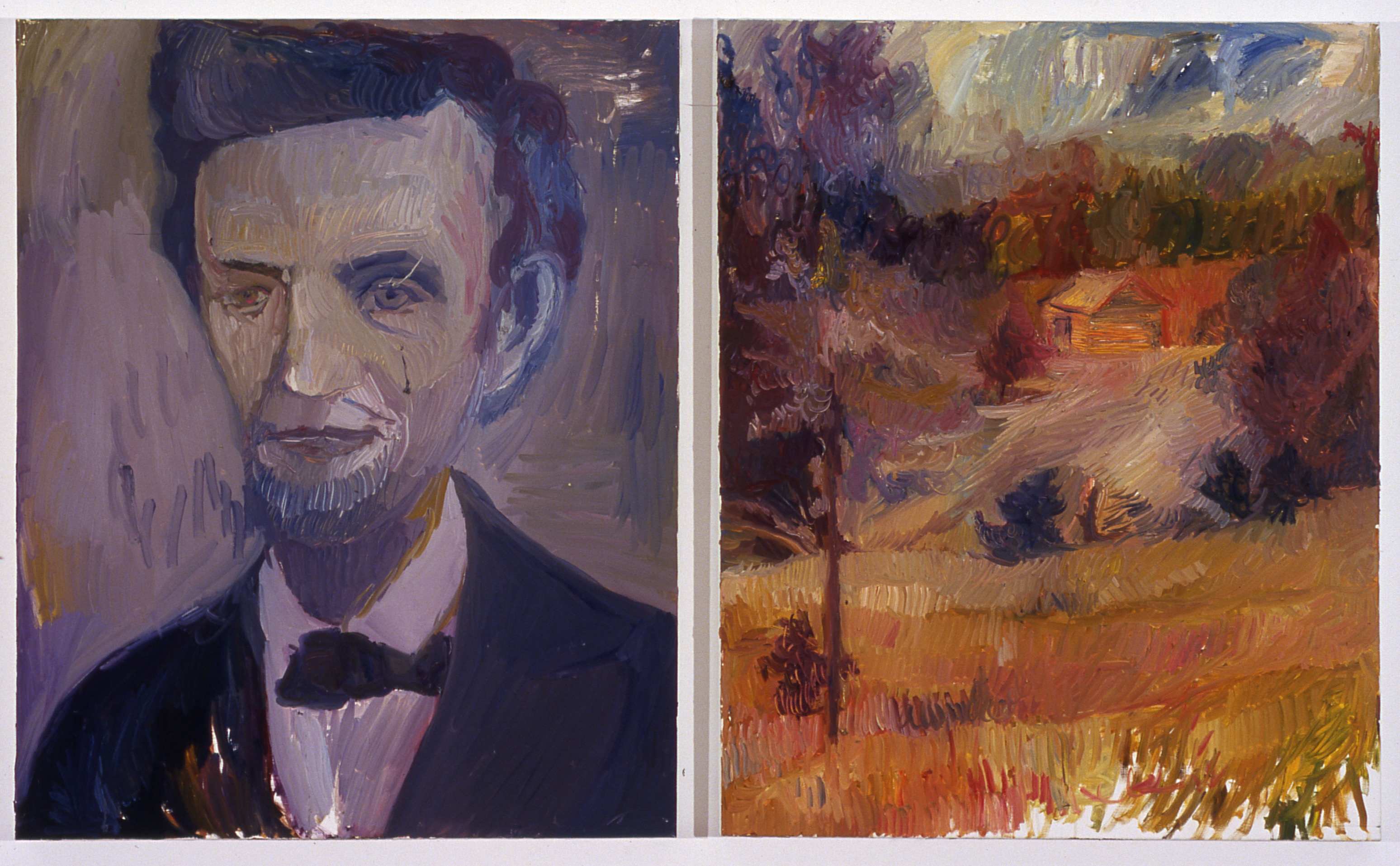 I painted this specifically for the Biennial, but also knowing it would—like a coming attraction for a movie—first appear at a NADA fair in Miami. I wanted it to be specifically at this fair, as being in Miami, Lincoln is a dynamic political image there that for me could be in part be an example of a "good Republican" who fought for the rights and agency of the American people, which in a time that race is still a factor, and the rights of LGBT people is in a current state of struggle, the vision of Lincoln seems more pertinent and dynamic than ever. More than merely Miami, however, I knew of and was creating my non-linear narrative installation "My American Dream" for the Whitney, and I absolutely wanted Lincoln to be included. I have rendered him several times before, in diptychs (with portraits with his cabin at his side-"Lincoln Remembers," from when W. Bush was first elected and I was missing my partner Andrew who was at our cabin in CA, a drawing diptych of Lincoln and Obama coming on stage for his inaugural address, and more). I have been thinking of Lincoln in the past few years and have been wanting to paint him again, collecting images and contemplating, and also waiting for the Spielberg movie-that serendipitously came out during this time-to subside so neither I or my viewer may be too influenced either by that wonderful interpretation by Spielberg and Daniel Day Lewis.
