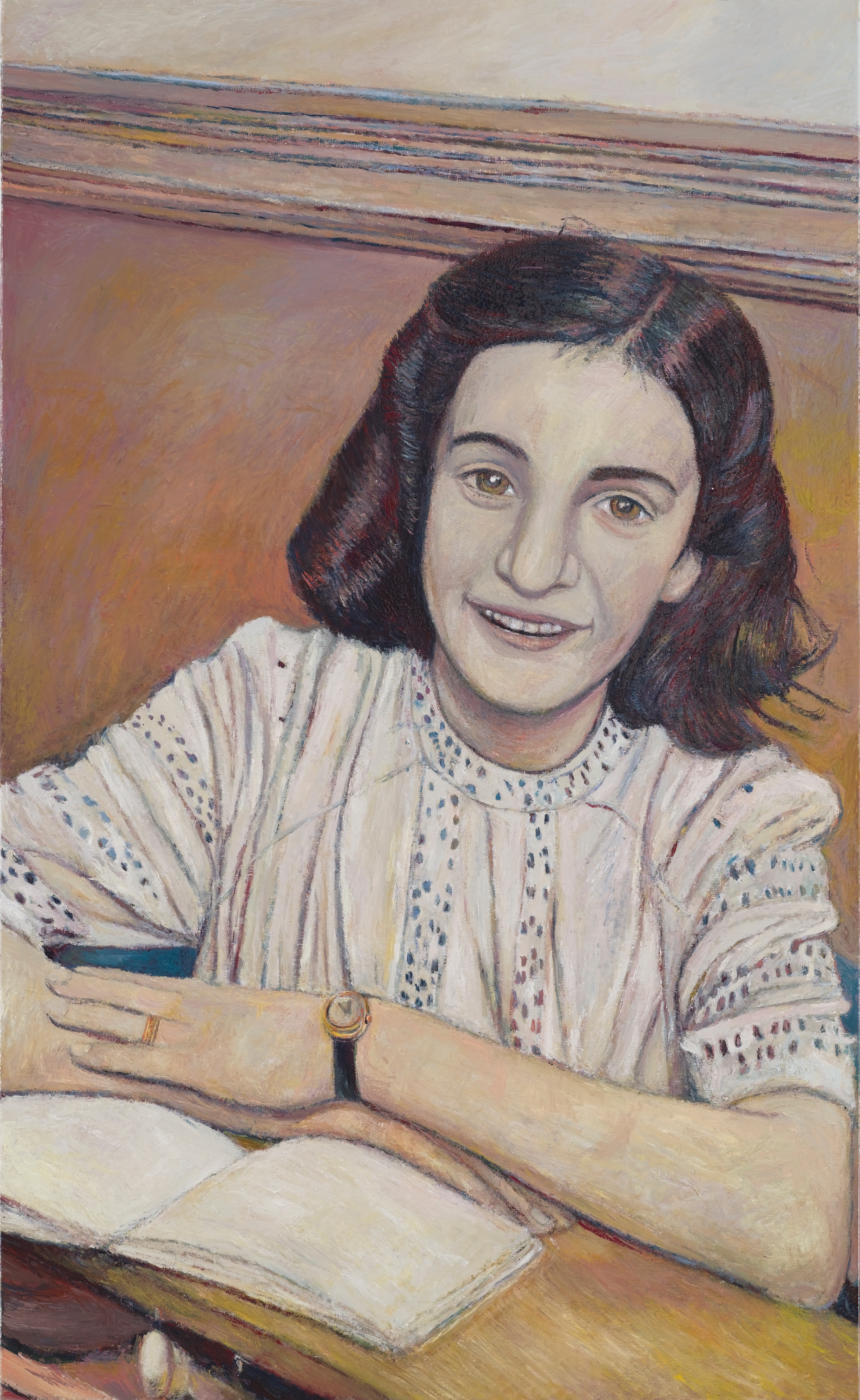 “When I first went to the Anne Frank house in the late ’80s after college, I was deeply moved by the experience, and was struck by the way that she had pasted, salon-style, images that gave her optimism, contemplation, and hope in her room. I found an affinity in how she was able to juxtapose art reproductions with pop iconography, and, by being on the same plane and surface, make powerful historical images equitable (and more personable) by bringing them next to charming illustrations and photos from her everyday world. Certainly, there is a melancholy associated with any photo of an almost-lost moment, and in the patina of time as the yellowing clippings became almost the same color as the mustard-palate wallpaper behind it, the collective peeling look brought out the synesthetic emotions of the whole environment. Several years ago, when I went back to the Anne Frank house, I was struck again by her room—when she first pasted the photos on the wall she declared it to be (I’m paraphrasing here?) like a “huge drawing” and it really does work this way… I also realized that I had spent a large part of my career making shows of open-ended narratives, by juxtaposing “high” and “low” images together in installations of paintings and drawings that have a distant cousin in that room. The room, like the house, is a character, and I was inspired to paint an image of the space photographed as it may have been furnished in her time, as it really resembled—and importantly, could stand in as an allegory for her experience—Van Gogh’s room, another Amsterdam hero.