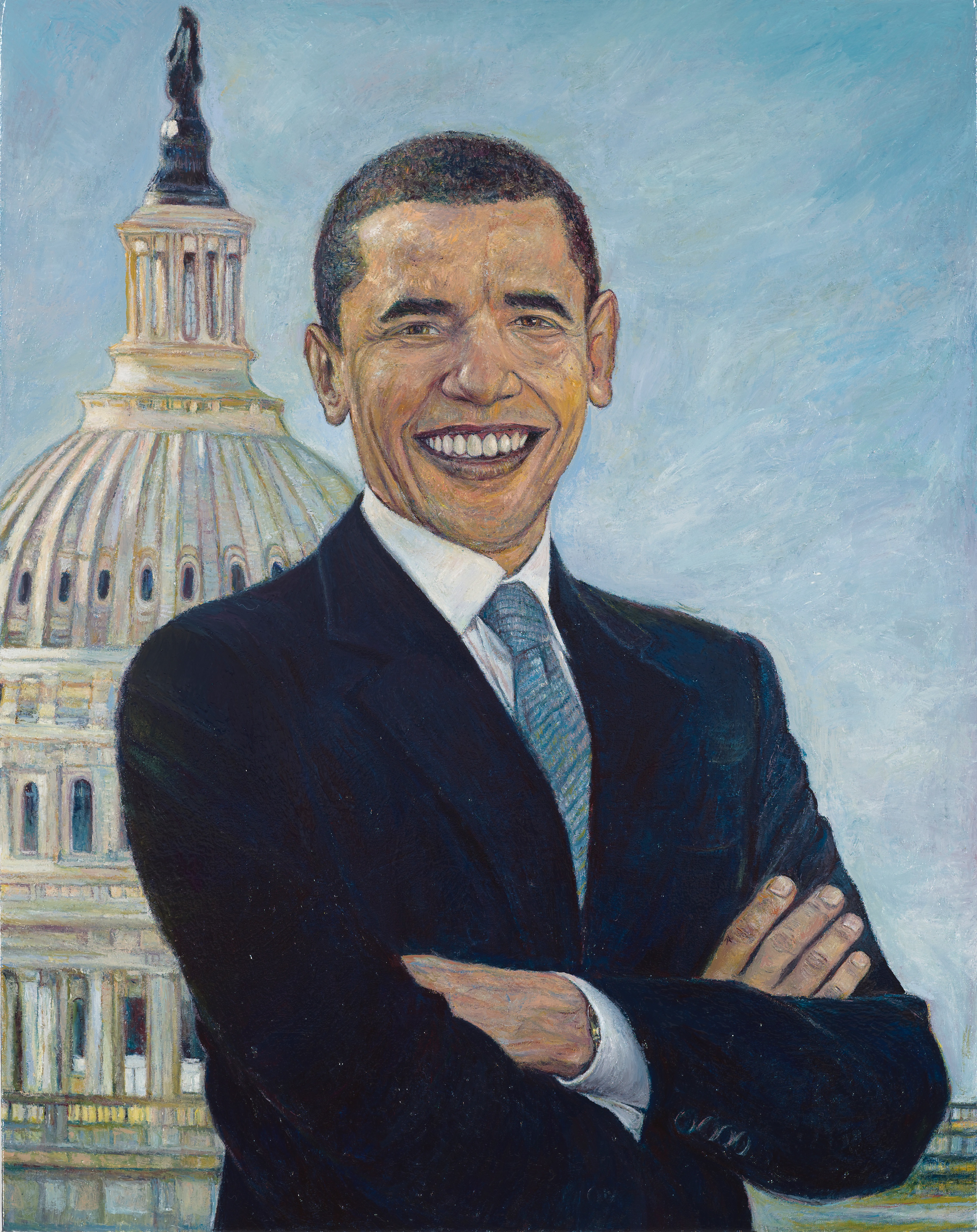 While looking for another image of him, I stumbled across the photo I created this from in an old Life Magazine, and although it was small (and black and white) was struck by not just the obvious joy and togetherness it represented of his family, but also how wonderfully symbolic it seemed, with the parents “teaching” the children how to play, and the mirror in the background reflecting into “our space” to invoke the viewer’s position within the paradigm of the picture. Although the painting veers from photographic representation, I hope how its not like the photo is what is “me” about it, inspired while creating this listening to King’s speeches, audiobooks about him and the movement (especially “Bearing the Cross: Martin Luther King, Jr., and the Southern Christian Leadership Conference” by David J. Garrow), and music he liked and listened to in his lifetime. The wallpaper, while painting this work, seemed to come alive, and I was aware of the angelic-like way King’s presence still works upon our world. The debates between Hillary Clinton and Barack Obama were also playing out during the working process of painting this, and afterward, I was struck how, especially in the depiction of Dr. King’s son, my picture almost seemed like a younger version of Obama, as both Obama and Clinton invoked Dr. King repeatably in their remarks, and how generationally we’ve grown as a country because in part of King, his passion, and extraordinary work and sacrifice to even consider a black man (and a woman for that matter!) as President, much less elect him into office (now twice!). The full quote is “Yes, if you want to say that I was a drum major, say that I was a drum major for justice. Say that I was a drum major for peace. I was a drum major for righteousness. And all of the other shallow things will not matter.” Although the edited version of this was subsequently chiseled in (and now edited off) the King memorial in D.C., I thought at the time I created this work, that King’s legacy extended through his family generationally, and now to the world, where hopefully we are all “Drum Majors for righteousness,” learning in part from the lessons of Dr. King, his family and all their great work.
