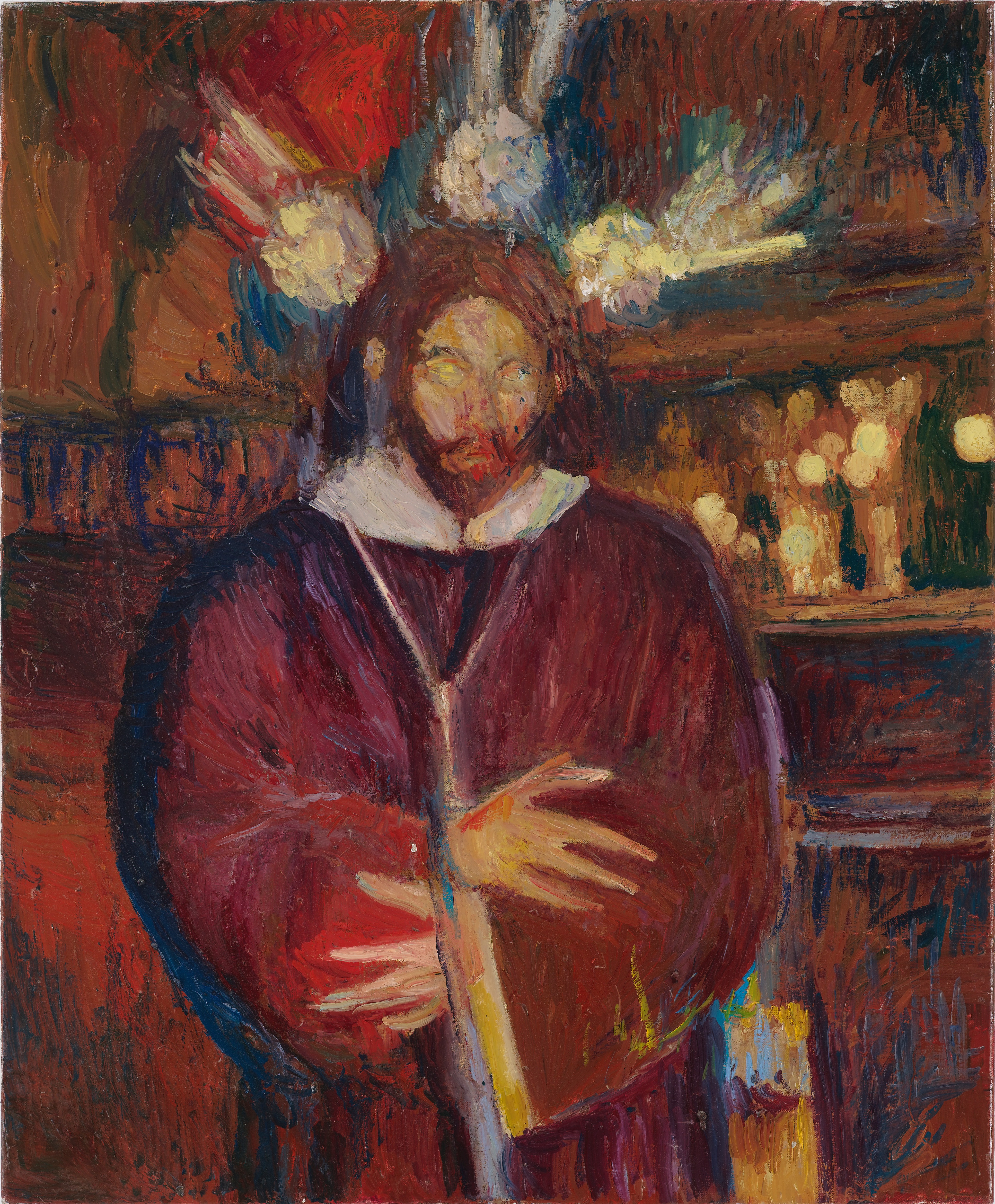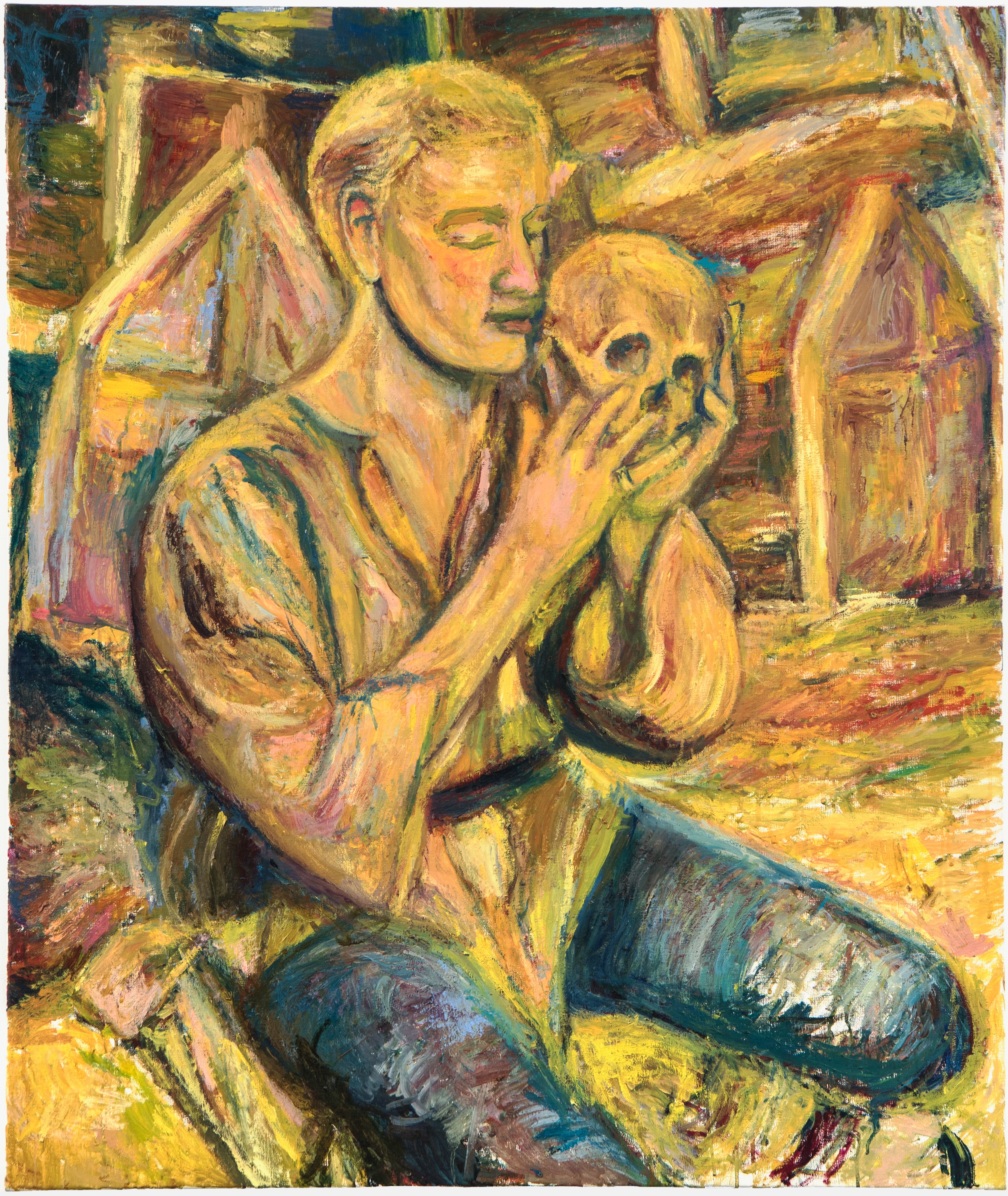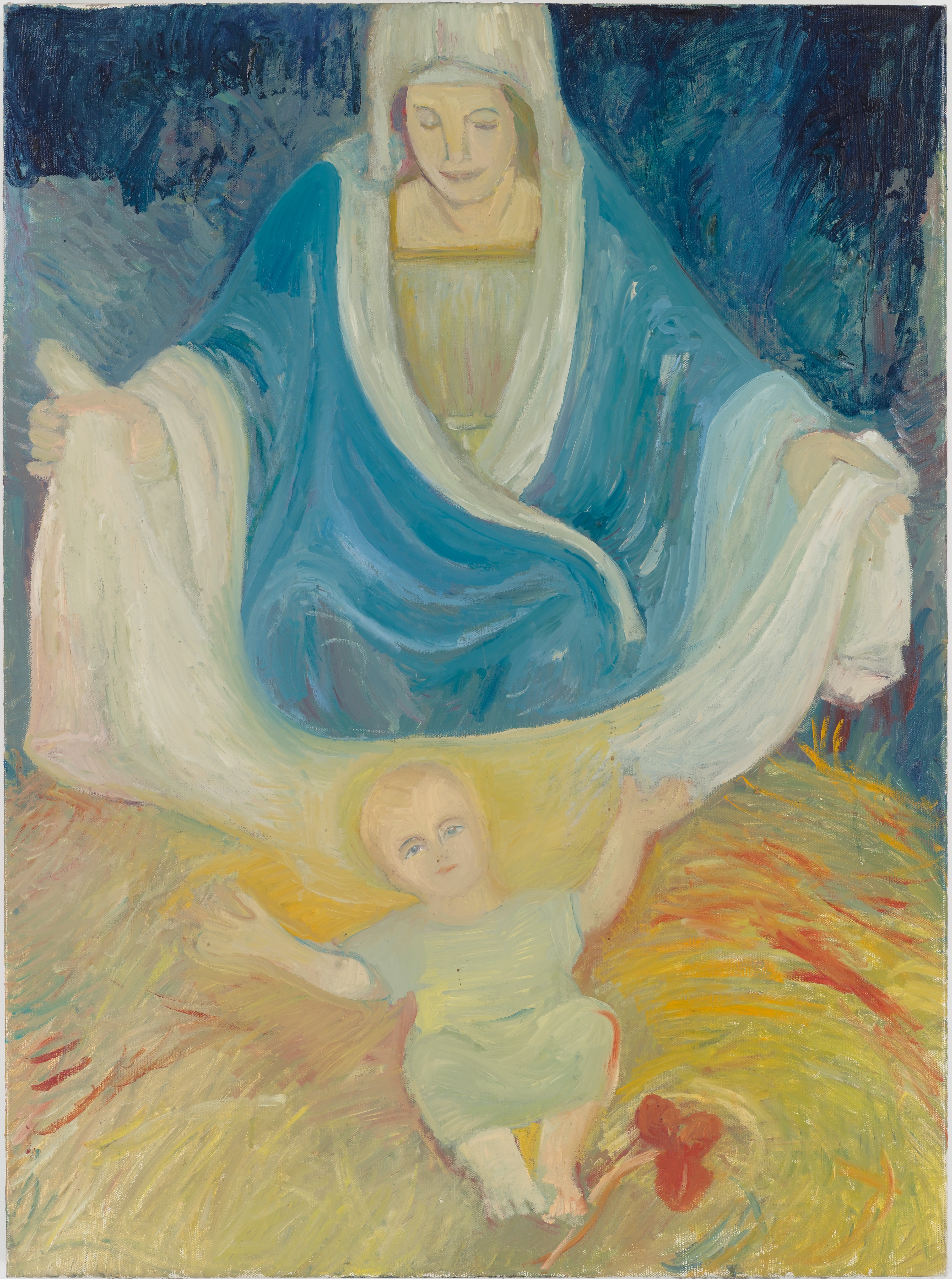 We lived for a long time in a tiny apartment on Prince between Sullivan and Thompson—the two of us, my German Shepherd Julian and our little poodle Rosa. I would take the dogs around the block, and would always stop at the church between those two blocks on Houston, and say a little prayer looking at their great Madonna statue. I’m not religious—my dad is Jewish and my mom is Southern Baptist, so I’m a religious mutt, but I am a spiritual person, and a little prayer can always help! In any event, this painting is to bring good energy to the wall, she was Gertrude in my Hamlet 1999 series, and here she really is the Virgin Mary. The wall has so much pathos that as much good energy and prayer I could give it starts out the narrative optimistically before we see them at the end. I painted this work, one of the first from my own photos that I created, in a moment where I really needed the joy it could provide—religious or not, icons this powerful are edifying to project to and with, and I hope her spirit can overlook all those on the wall and the show with the powerful love she symbolizes.
