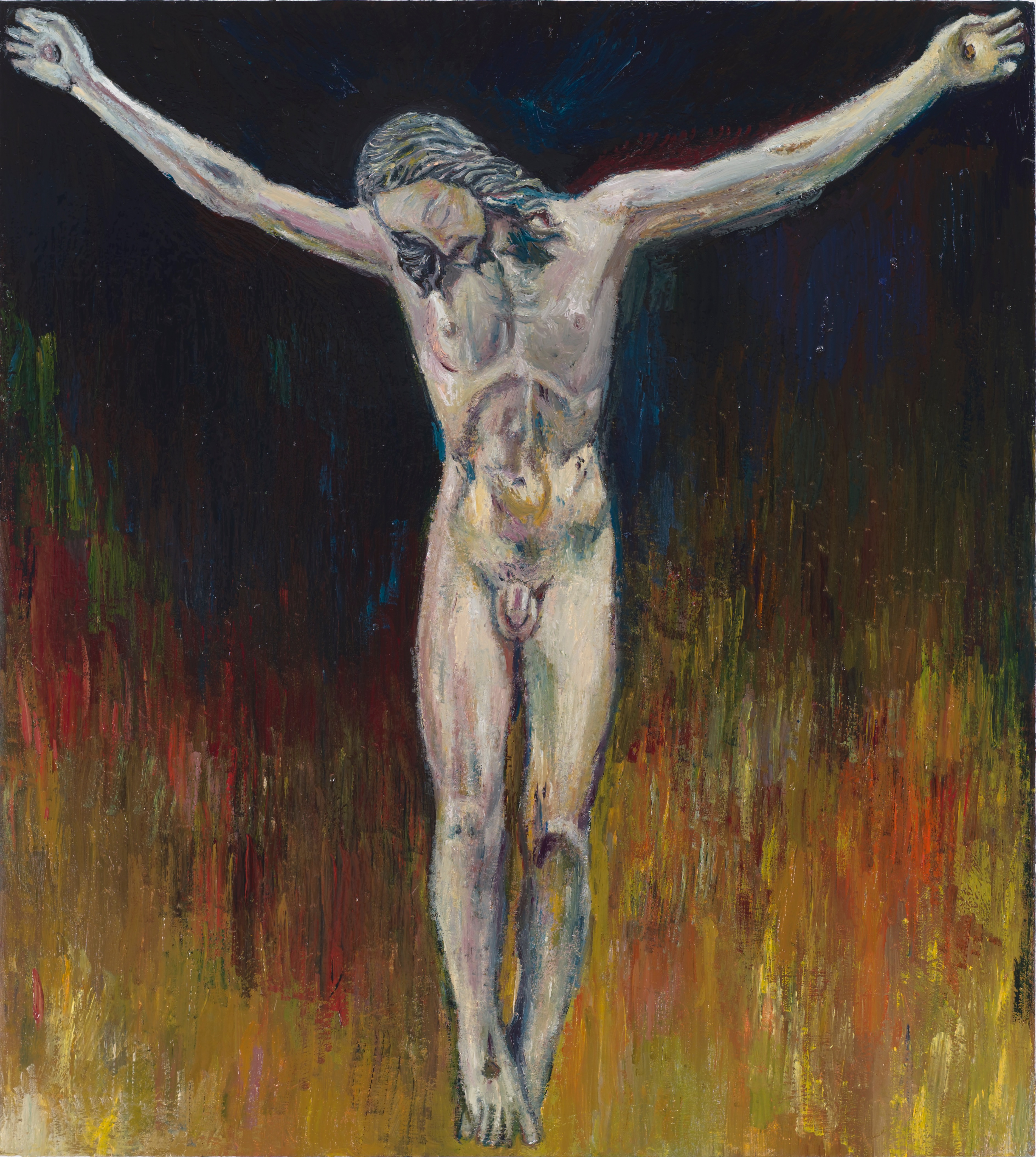 Near this same time, I did this Jesus painting of Michelangelo’s crucifix, which is the one at the Santa Maria del Santo Spirito di Firenze, Florence. I love Michelangelo for his embracement of both the sacred and the profane, and in this early sculpture of his (one of the earliest on record—he was only 17 when he created it!) he truly captured an uncanny spirit. I have yet to see it in person, but the photos of it send me—there is something sensual about his body, but not erotic, simultaneously it also seems alive, or to be specific, both dead, as it is Jesus on the cross, but also alive with a spirit. I love to learn from the masters, following their lead, with Michelangelo, whom I have painted many appropriations from (including the Green Jesus painting on the last Last Judgment wall, which is a close up of this very same Christ, and the other crucifix on that wall is the other Crucifix statue attributed to Michelangelo from the same time), and his chisel marks give me guidance as to create form in paint. When painting from his painting (again, the Last Judgment Wall is a quote of the Last Judgment—in fact, this whole show and that wall is to invoke the Sistine Chapel!) I learn what it is to be a true artist, painting from devotion to my subject matter. This is a work I absolutely needed to paint when I did (I feel I’m projected unconsciously in the negative space surrounding him). I also learn, by following the Masters, to be creating works that transcend their subject matter: beyond any decorative motifs, I paint through my life and live through my paint.