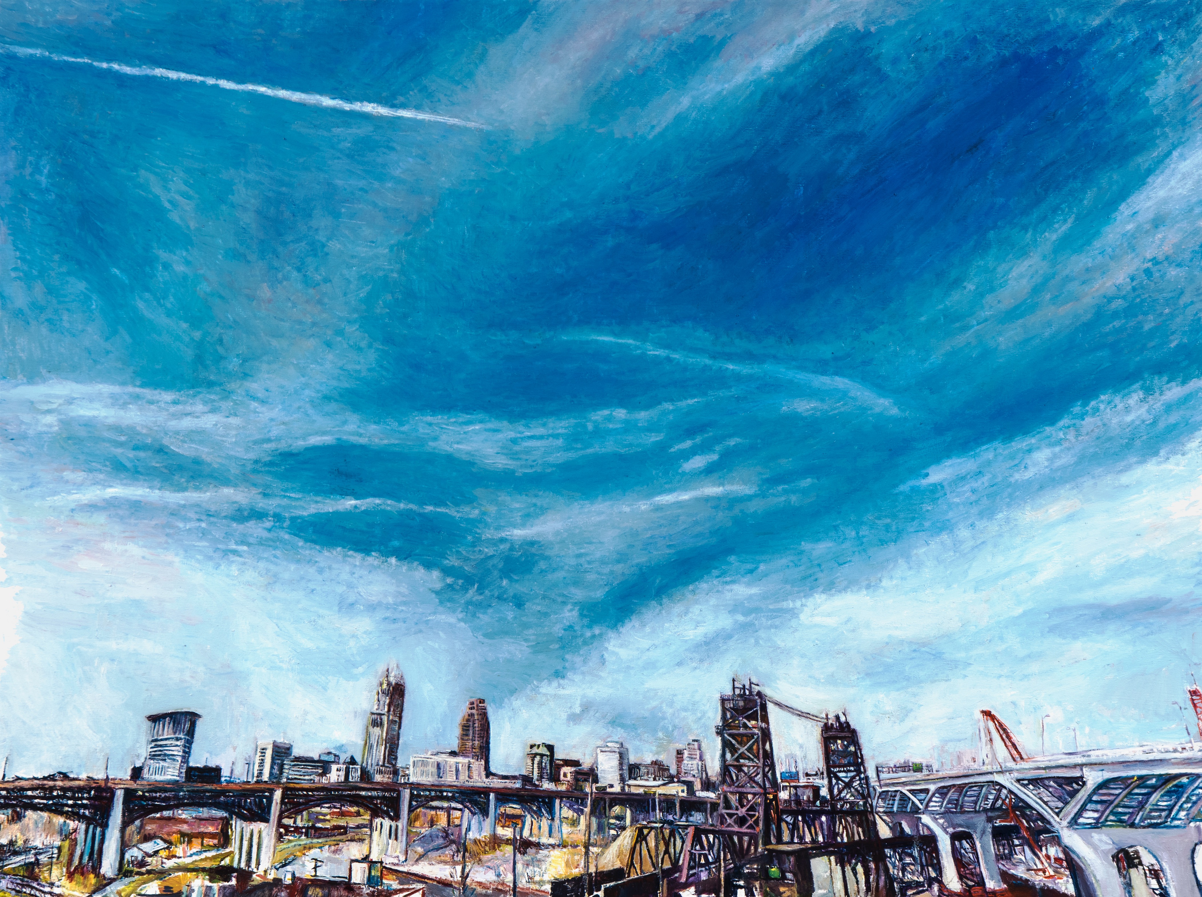 I had been wanting to create this work since the advent of the Freedom Tower as an antidote to the 9-11 paintings I created, and also as a symbol for the power of New York City, of America, and an optimistic view of the future. I had met the creator of the spire, and he mentioned to me that, like in a lighthouse, there was space for one person at the very top of the needle. It was always my hope to get up in there, like Turner tied to the masthead of a ship for the sublime rush of the experience being the highest you could get overlooking the City, and to paint the image with the feeling of the memory of the experience. I couldn’t get access, but serendipitously, Bob Mankoff, the cartoon editor of the New Yorker had called me and wanted me to come and meet me in their new offices at One World Trade Center!