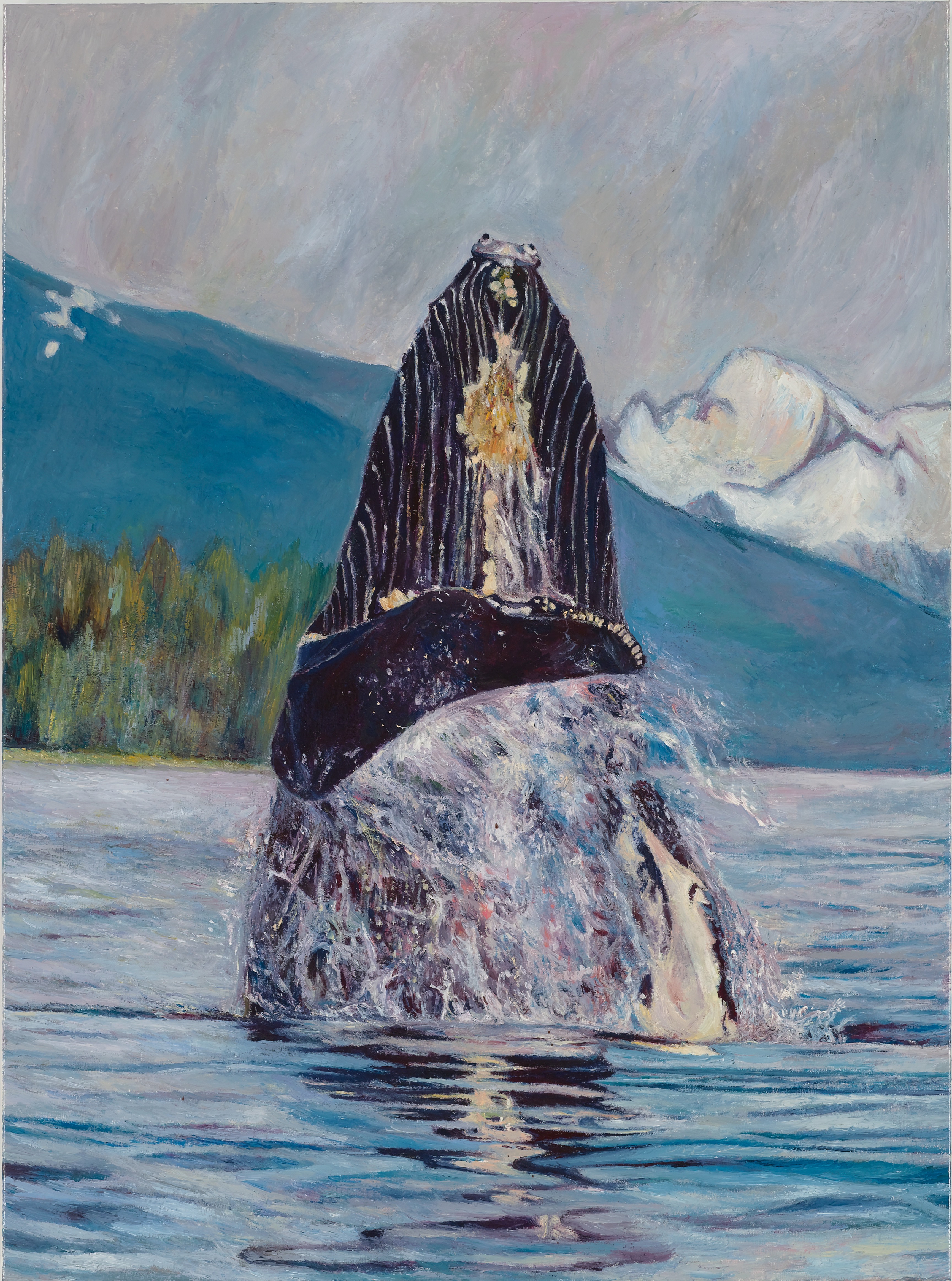 This is from a scene in one of the David Attenborough nature series, of Humpback whales in the southern oceans of the Antarctic, who "fish" there for krill, a shrimp-like crustacean that exists in abundance, and the many birds all the other wildlife that this incredible event attracts. So many of the whales somehow know to go to this area, and work together to form net-like rings of bubbles that gather the krill in the center in which they come up the middle of to feast. I had wanted to do a painting of a real utopia, but was thinking of creating a painting of Bal’I Ha’I, from the film music South Pacific, of a mysterious island of paradise, and realized that real utopias do exist on Earth. Whales are such mysterious creatures that we still don’t know much about (although I’m a firm believer that they are sentient creatures that have a high degree of sophistication and would communicate with us more if they could), and scenes like this for me reach the sublime of nature, that we don’t know so much about this world and all of whom we share it with, and we are such narcissistic creatures we forget we are small part of the cosmology of living things in our world and our universe. I placed this work in a heavenly realm on the Last Judgment wall as I feel it truly is a heaven—perhaps we become reincarnated as whales or dolphins when we pass—maybe those who are doomed are the krill! But in all seriousness, heaven is on earth, beauty is everywhere on our planet, and I hope that we can survive as a species cultivating life on our planet instead of destroying it, getting smart about how to be our Earth’s caretaker for all those who benefit from it, most of all ourselves and future generations who rely on what we do now for their future—for us and all of our mother earth’s inhabitants. I hope like my other works this breaks into an abstraction, specifically allegorical for this one as we are like the fish in the sea—there are many of us and we need to cohabite with one another, respecting each other and our differences, and be together in our lives on our globe in order fur us to survive positively into the future. I do believe that art can change things for the better, and in my old age I would rather paint utopias than dystopias, as I want to live in the place I’m rendering to be in that meditation of my moments, in order to create works that will hopefully inspire others in their ponderings while looking at it—I think if we can all agree we need whales to be alive and roam free in our waters, along with other animals endangered or not to be alive on our planet, then that starts the even bigger conversation how we can do this all together in a karmic spirit of community and cooperation, commiseration of empathy and compassion for all.