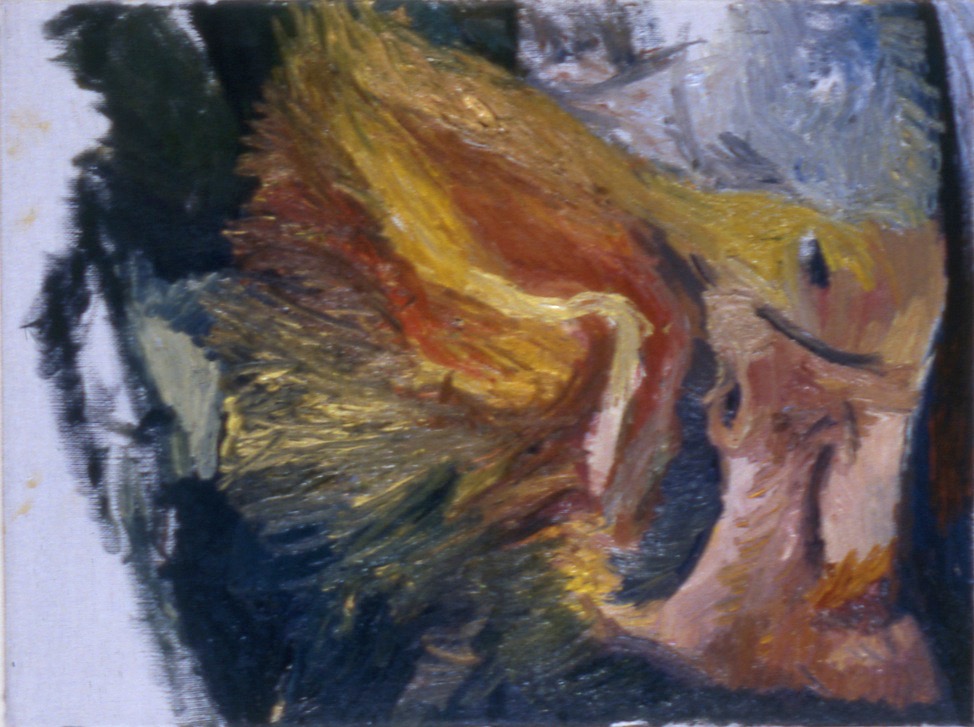 This is a picture of Montgomery Clift, the great pre-method actor, from the last scene in the underrated film Raintree County, where he plays a hapless union soldier, suffering for his misbegotten wife played by his real-life dear friend Elizabeth Taylor. In this scene, he is lying in a field, which reminded me of my favorite Rimbaud poem, “The Sleeper in the Valley” which describes everything in this beautiful, dystopic meadow, which at the end reveals a dead soldier in the midst of living nature. Monty Clift was a gay genius actor, that inspired the Method actors Brando and James Dean, who brought an extraordinary emotion and sensitivity to all hoe portrayed. In these paintings from the 90’s, I was allowing my own emotions to unleash themselves in my brush, taking film stills as mediums to meditate upon to transmute my unconscious into the image, having something else happen in the abstraction of the image. Like a phoenix rising from the ashes, a horse seemingly appears in his beard, a subconscious figure also emerges on the left, all brought about without my knowledge in the moment of my muse, which after it left my mind, I stopped painting, Cezanne-style, allowing the raw canvas to show through. This is the last of the figurative paintings I lived with on my wall that first premiered in my notorious Jay Gorney solo debut in New York in 1997, where I installed figurative works that broke into abstraction alongside abstract figurative works (if this isn’t an oxymoron). This was new to my audience, but also the art-going audience in NYC at that time, where figurative painting, unless it was John Currin or Lisa Yuskavage, was outre, in a moment that Art and Fashion thrived and photorealistic appropriation was the norm. Although Soutine was uptown at the Jewish Museum (along with upper east side great exhibitions by De Stael and more), downtown people couldn’t understand what I was up to—but the artists, especially the painters, did, and I like to think that this was ahead of its time, but also following time, as the expressionist zeal of my painting was seeded by my early love of the German Expressionists. This painting in particular is very personal, as it was my gift to my now husband Andrew for supporting and understanding my experimentation and the Gorney show, and this painting lived on our walls for years. I mistitle it Red River, as this was the first Monty Clift film, where he challenges John Wayne his adoptive father, and perhaps like myself, he is waxing nostalgically for his youth, thinking of his roots in his older age, soldiering on…